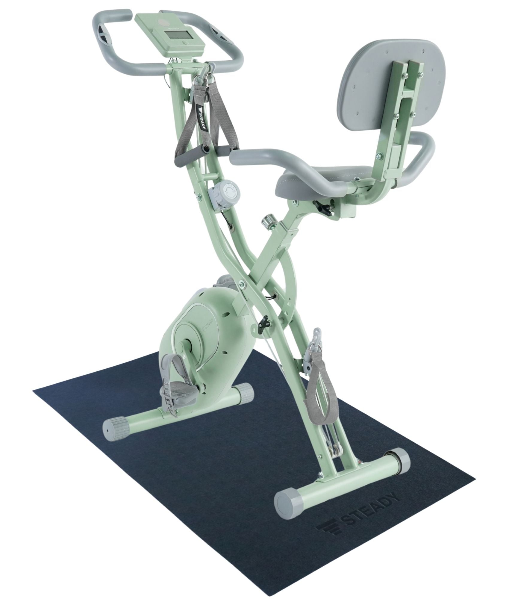 A.付随のバンドでは、腕・肩・背中・大胸筋などの上半身トレーニングに加え、脚・ヒップ・膝周りの筋力トレーニングにも対応しています。 漕ぎながら同時に鍛えられるため、有酸素運動+筋トレの時短トレーニングが可能です。